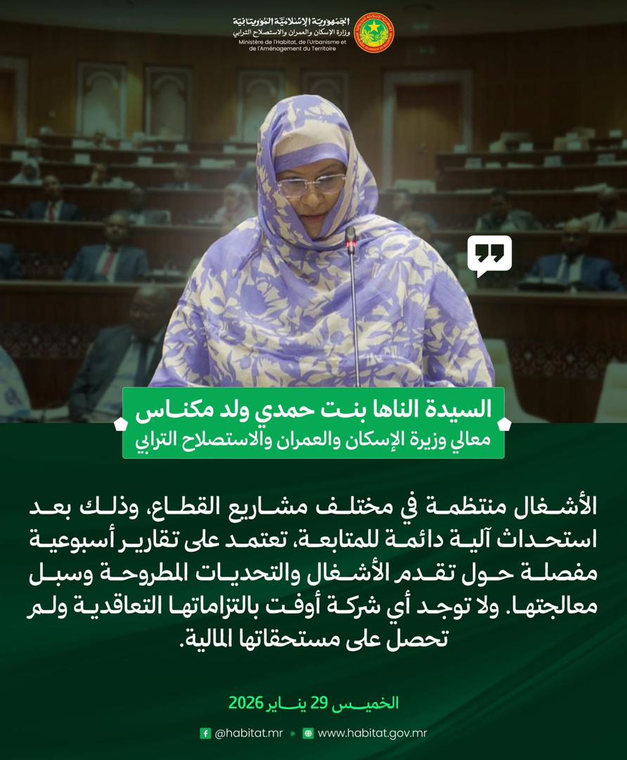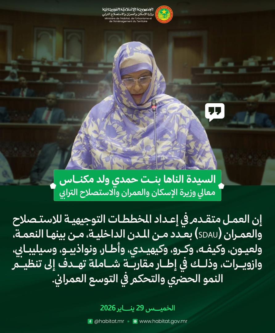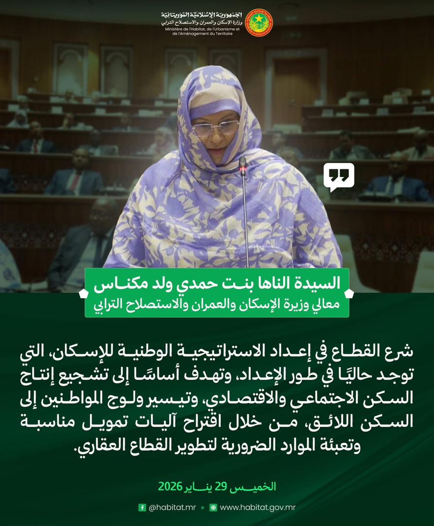 وزيرة الإسكان والعمران والاستصلاح الترابي، السيدة الناها بنت حمدي ولد مكناس، في إجابتها على سؤال شفوي مشفوع بنقاش، خلال جلسة علنية بالجمعية الوطنية. 23:45 - 2026/01/29