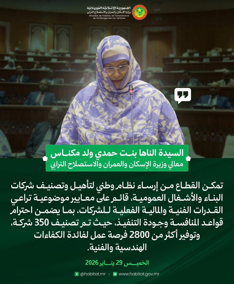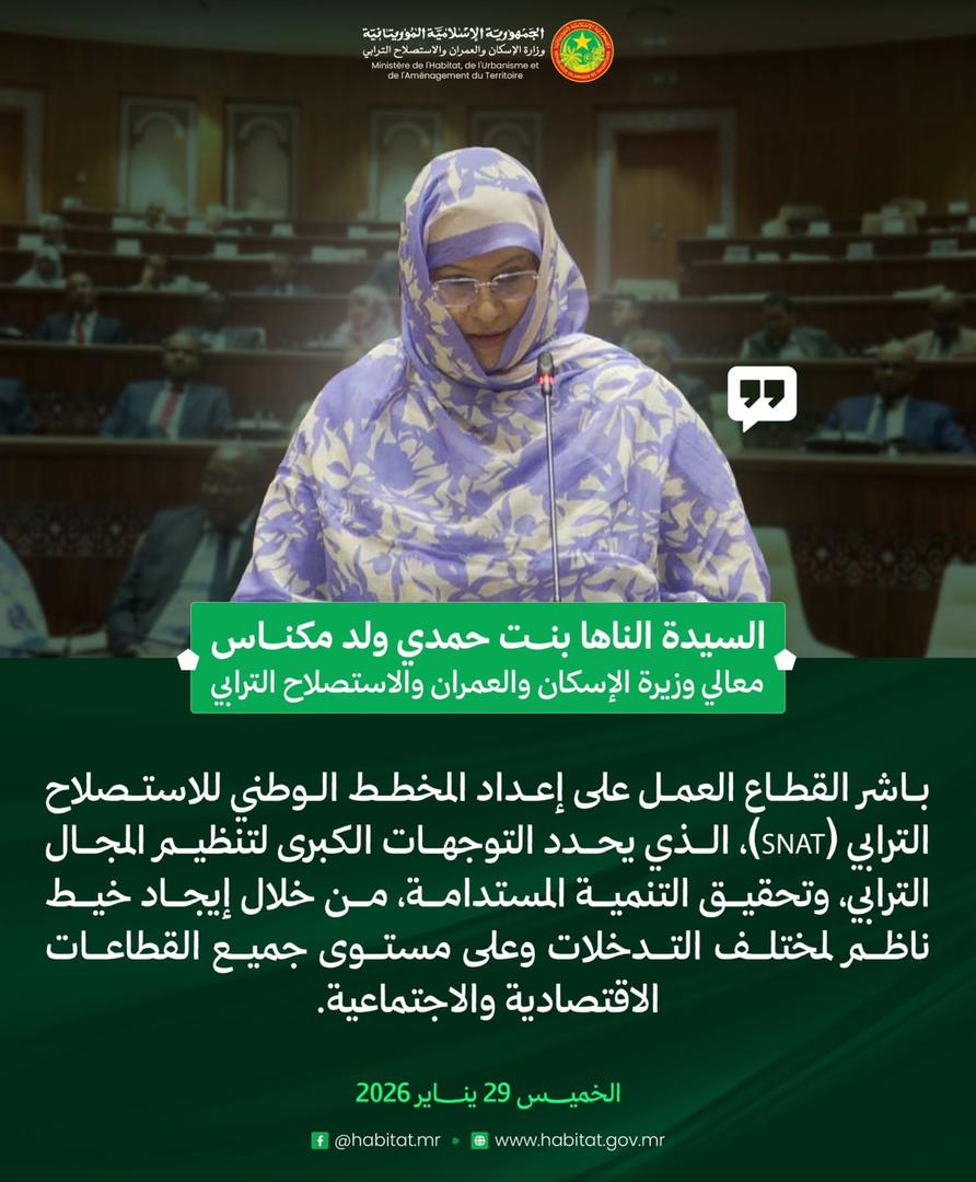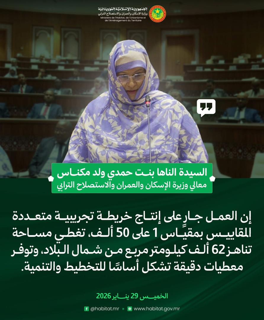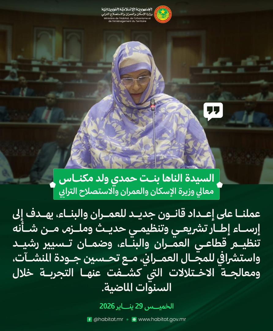 وزيرة الإسكان والعمران والاستصلاح الترابي، السيدة الناها بنت حمدي ولد مكناس، في إجابتها على سؤال شفوي مشفوع بنقاش، خلال جلسة علنية بالجمعية الوطنية. 23:45 - 2026/01/29